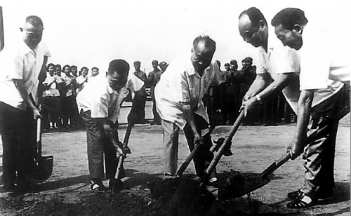 开工典礼现场,年近八旬的朱德同志为北京地铁铲下了第一铲泥土。