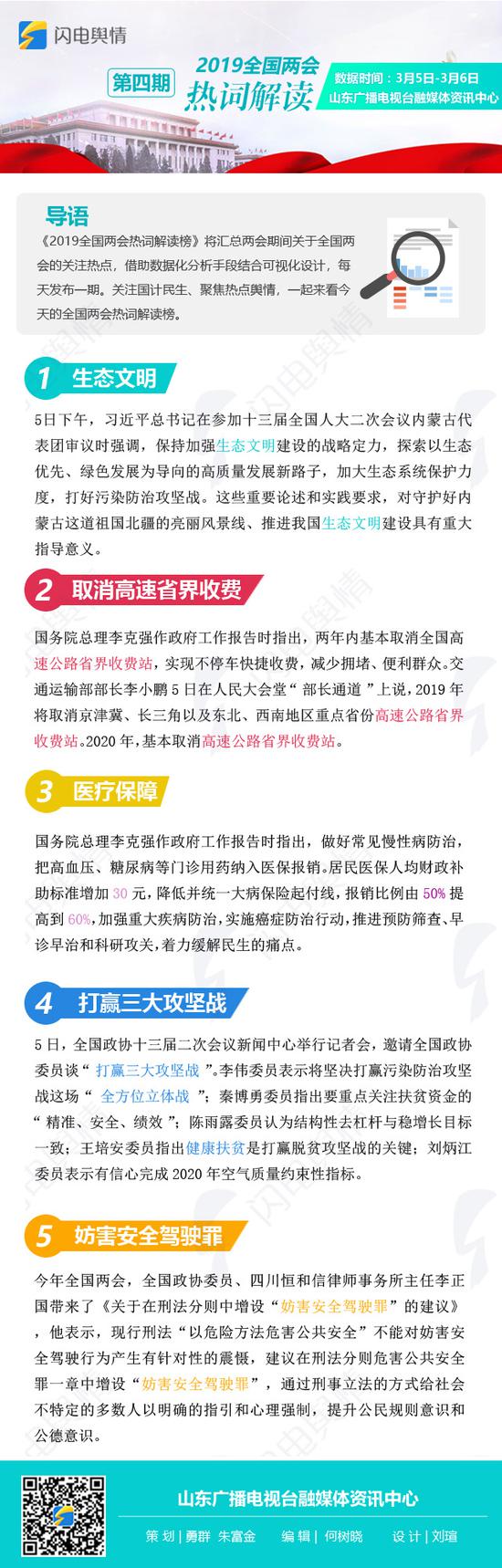 2019年3月3日起,中国进入“两会时间”。一年一度的全国两会是全体中国人政治生活中的一件大事,是一场承载着全民期待的举国盛事。2019年全国两会将聚焦哪些最新热词?哪些两会话题备受瞩目?关注国计民生、聚焦热点舆情,山东广播电视台融媒体资讯中心利用闪电大数据舆情平台推出2019全国两会每日热词解读。“生态文明”、“取消高速省界收费”、“医疗保障”、“打赢三大攻坚战”等成为3月6日网民关注的热词。