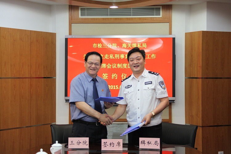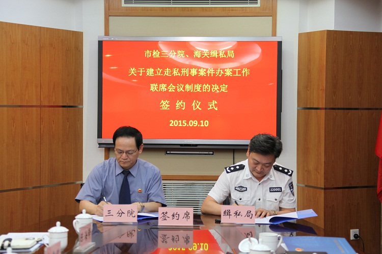 9月10日下午,三分院与上海海关缉私局就走私刑事案件办案工作召开联席会议。三分院检察长陆建强,副检察长高孝义,上海海关缉私局局长齐亚洲,副局长李清,以及双方相关部门负责人出席会议。会上,双方通报了2015年1月至8月的走私刑事案件办理情况,研究了后续相关工作,并会签了《关于建立走私刑事案件办案工作联席会议制度的决定》。