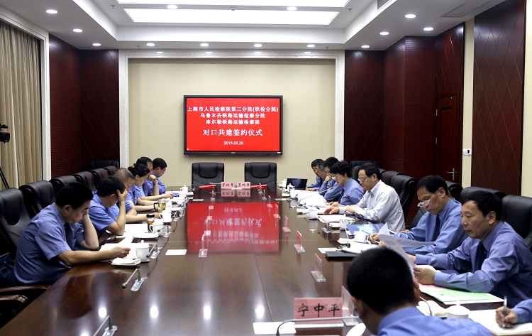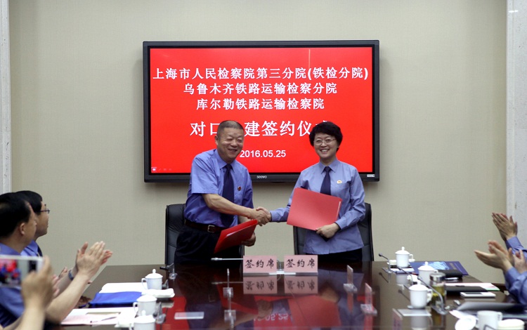 5月25日,三分院(铁检分院)与乌鲁木齐铁检分院、库尔勒铁检院签订对口共建协议。高检院铁检厅副厅级检察员曹康、分院检察长陆建强出席并讲话,李文副巡视员代表分院签订对口共建框架协议,樊荣庆专职委员主持签约仪式。乌鲁木齐、哈密、上海铁检院相关领导参加签约仪式。