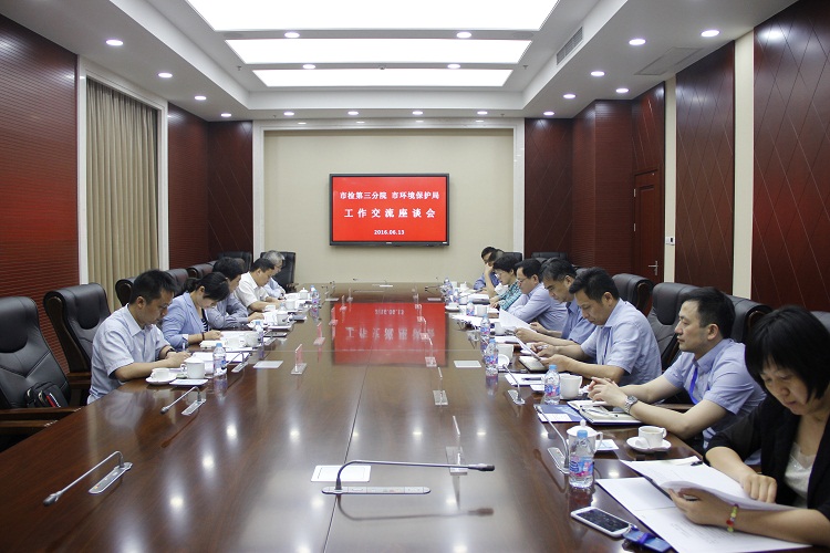 6月13日下午,三分院与市环保局召开工作交流会,座谈研讨《关于行政执法与检察监督工作联系配合的备忘录》(征求意见稿),会议就建立行政执法与检查监督工作联系配合机制达成共识,并对进一步完善《备忘录》内容提出相关意见。陆建强检察长、高孝义副检察长、李文副巡视员、市环保局苏国栋副局长及双方相关部门负责人参加。