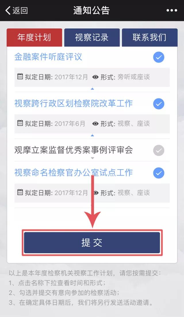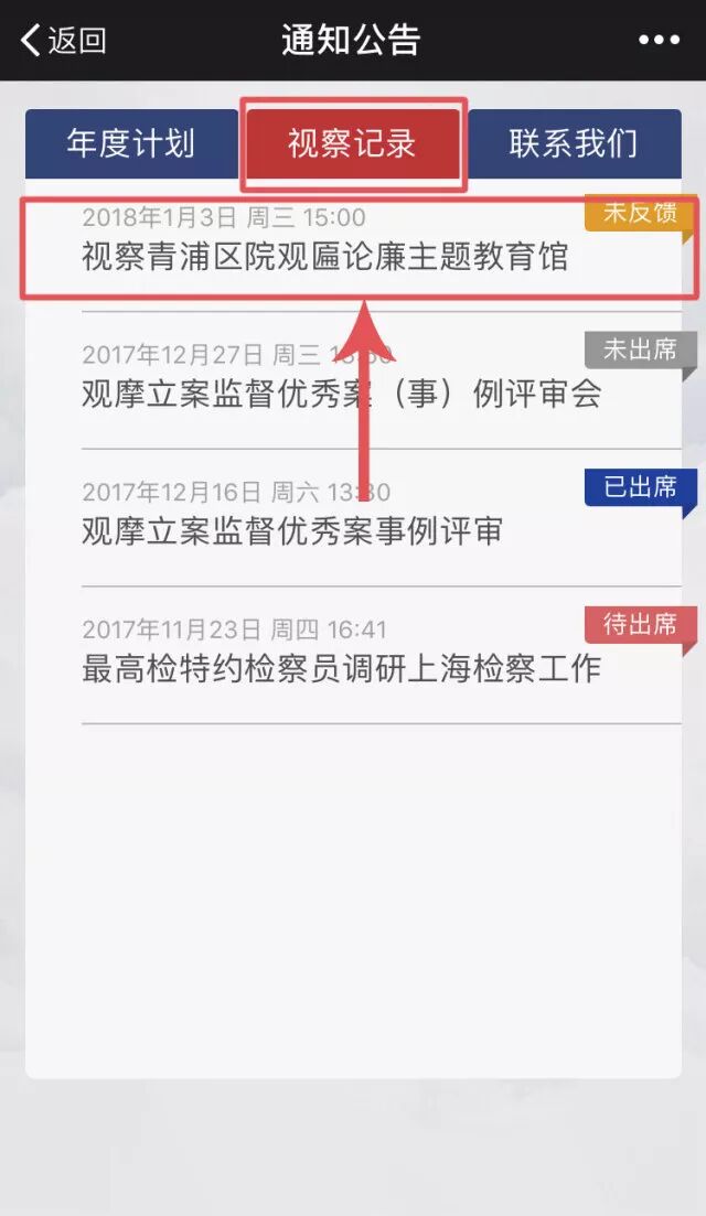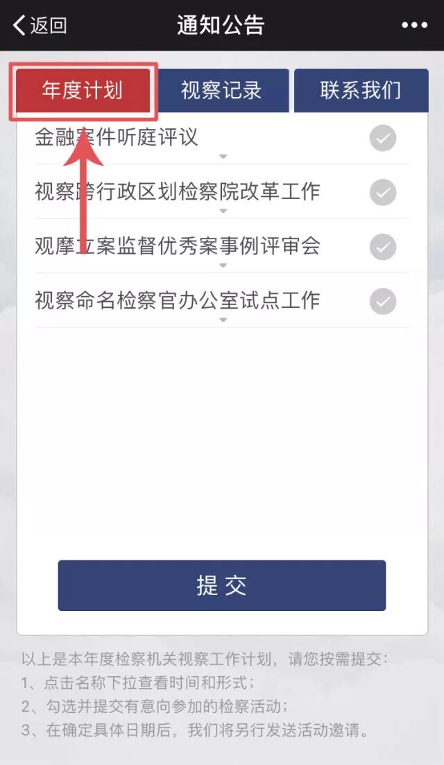 包含年度计划、视察记录、联系我们三个栏目,用于发送活动邀请、年度视察计划、接收意见反馈等。