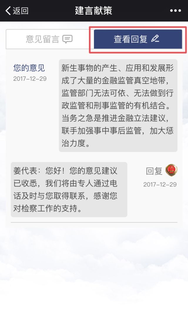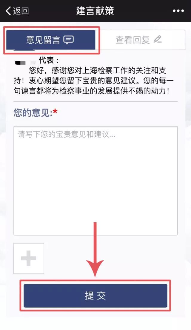 包含意见留言、查看回复两个栏目,用于接收意见建议并及时答复反馈。